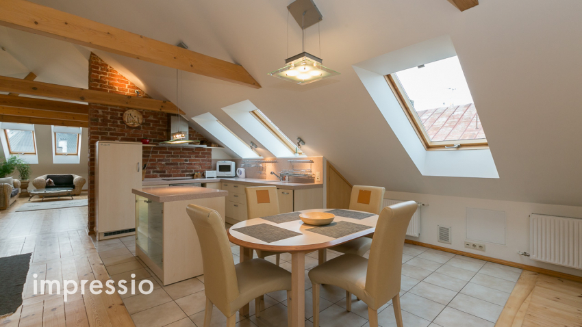 On the first level - A spacious living room with high ceilings and several roof windows, which gives an extra light and a feeling of spaciousness in the apartment. Fully equipped kitchen area. Two separate bedrooms, one of which has an exit to the terrace. Bathroom with a bathtub.
