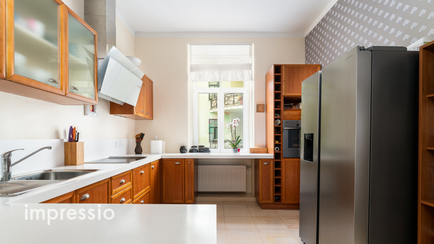 Spacious living room and separate dining area with kitchen. Three isolated bedrooms, located both on the Lāčplēša street side and on the courtyard. Bathroom equipped with a bathtub and shower, as well as a window. Separate utility room. Spacious built-in wardrobes in the hallway.