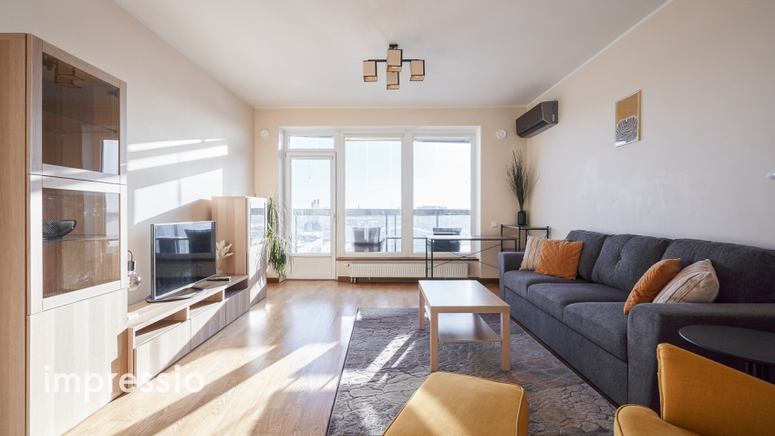 Viesistaba ar apvienota ar virtuvi, kas aprīkota ar plīti, trauku mazgājamo mašīnu, ledusskapis un ikdienā nepieciešamajiem piederumiem. No viesistabas ir izeja uz terasi ar skatu pāri pilsētai. Izolēta guļamistaba ar garderobes telpu. Vannasistaba ar vannu un veļasmašīnu. Domofons.