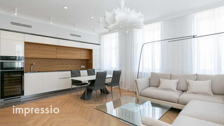 Просторная гостиная студийного типа с отреставрированной изразцовой печью и видом на улицу Элизабетес. Две отдельные спальни с окнами, выходящими в тихий внутренний дворик, ванная комната и гостевой туалет. Hа кухне встроенный кухонный гарнитур от Leicht. Вся необходимая бытовая техника от Kuppersbusch.