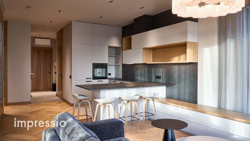 Гостиная с панорамными окнами и видом на центр Риги и Агенскалнс, а также выходом на просторную террасу. Кухня оборудована встроенной высококачественной бытовой техникой и каменной столешницой. Две отдельные спальни, обе с выходом на террасу. В обеих спальнях просторные встроенные шкафы. Ванная комната с ванной. Отдельный гостевой туалет со стиральной машиной. Просторный встроенный шкаф в прихожей.