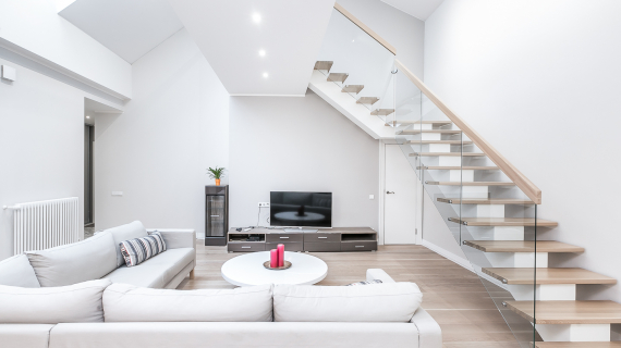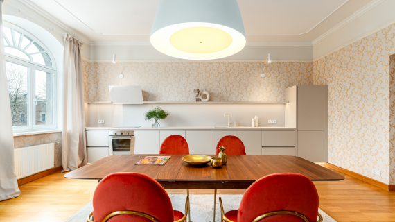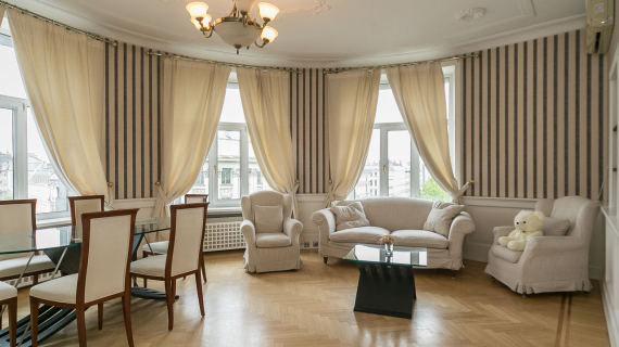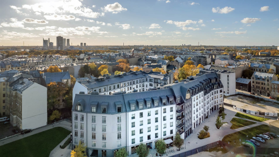 Качественная трехкомнатная квартира с видом на город. Гостиная с панорамными окнами и видом на центр Риги и Агенскалнс, а...